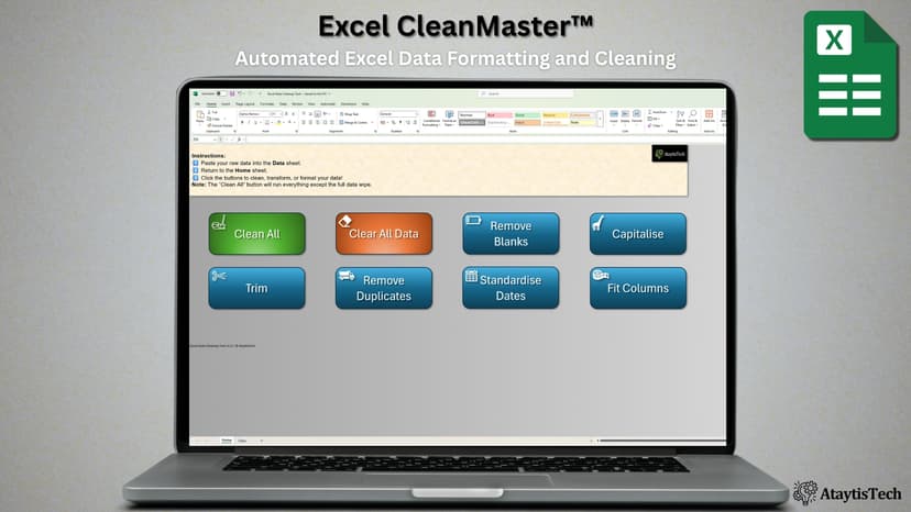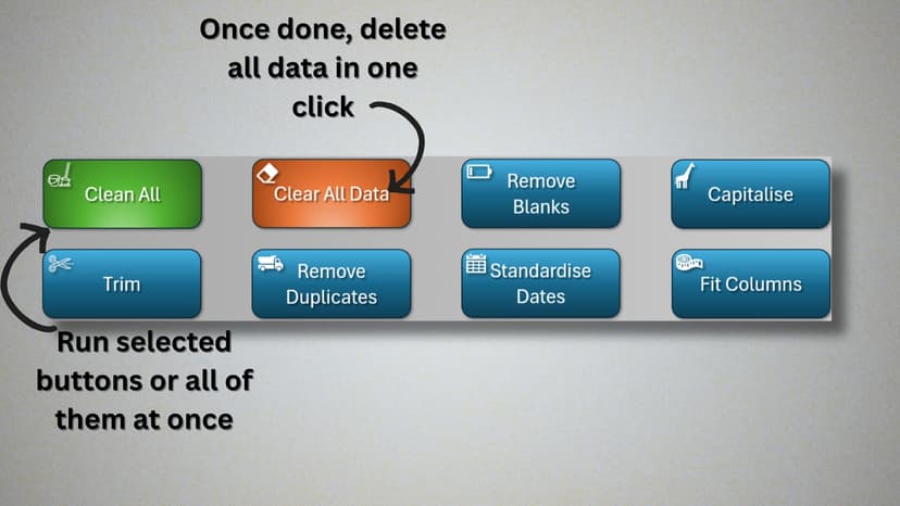 Choose any combination of actions—Trim, Remove Duplicates, Standardize Dates, and more—or hit Clear All Data to start fresh. Excel CleanMaster™ gives you the flexibility to target exactly what you need, or wipe the slate clean in a single click.