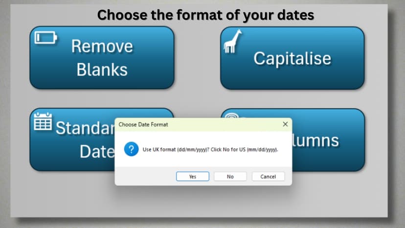 Select UK (DD / MM / YYYY) or US (MM / DD / YYYY) formatting in one click. Excel CleanMaster™ will convert every date in your sheet to the style you need—no manual reformatting required.